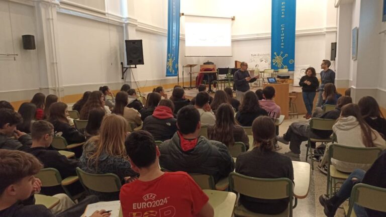 Os investigadores Helena Barreiro, Diego Fernández e José González Cao impartiron unha charla no IES de Ponte Caldelas, achegando ao alumnado as claves do cambio climático e o seu impacto nos eventos extremos, con especial atención ás inundacións na provincia de Ourense.